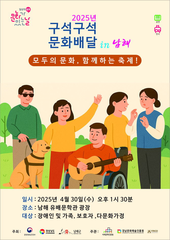 [프라임경제] 남해군은 4월 마지막 주 수요일(문화가 있는 날)인 4월30일 남해 유배문학관 광장에서 '모두의 문화, 함께하는 축제'라는 주제로 '구석구석 문화배달 4월 행사'를 개최한다고 밝혔다.