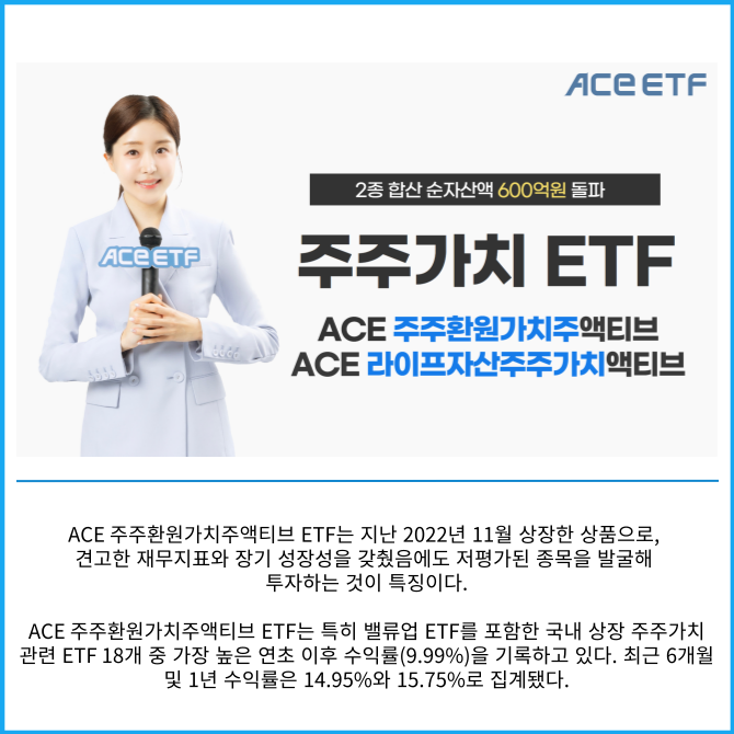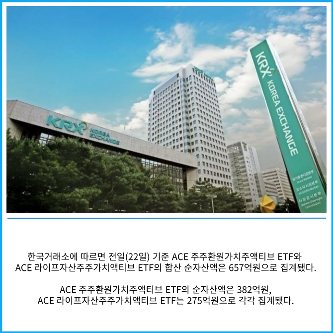 [프라임경제] 한국투자신탁운용은 주주가치 제고 기업에 투자하는 일명 '주주가치 상장지수펀드(ETF)' 2종의 순자산액이 600억원을 돌파했다고 23일 밝혔다.