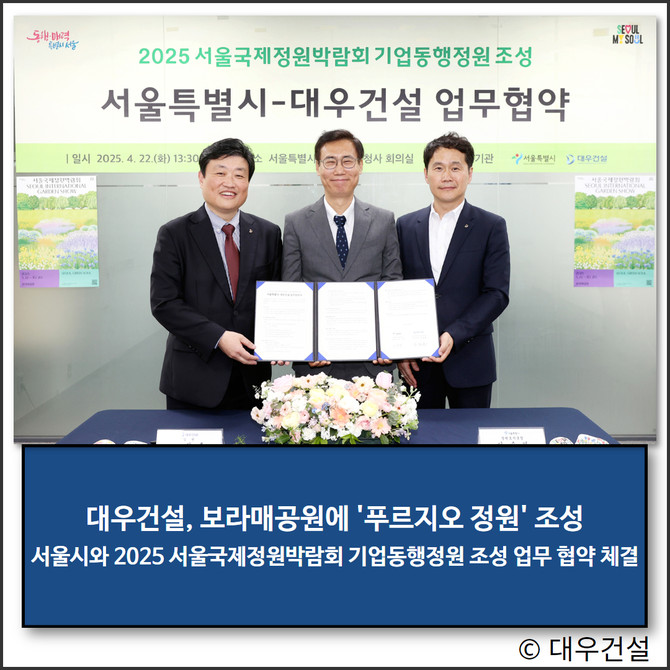 대우건설(047040)이 지난 22일 서울시와 '2025 서울국제정원박람회 기업동행정원' 참여를 위한 업무협약을 체결했다.