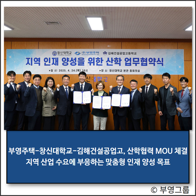 부영주택이 창신대학교, 김해건설공업고등학교와 함께 지역 산업 수요에 부응하는 맞춤형 인재 양성을 목표로 3자간 산학 업무협약을 지난 24일 체결했다.