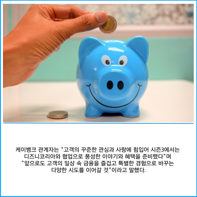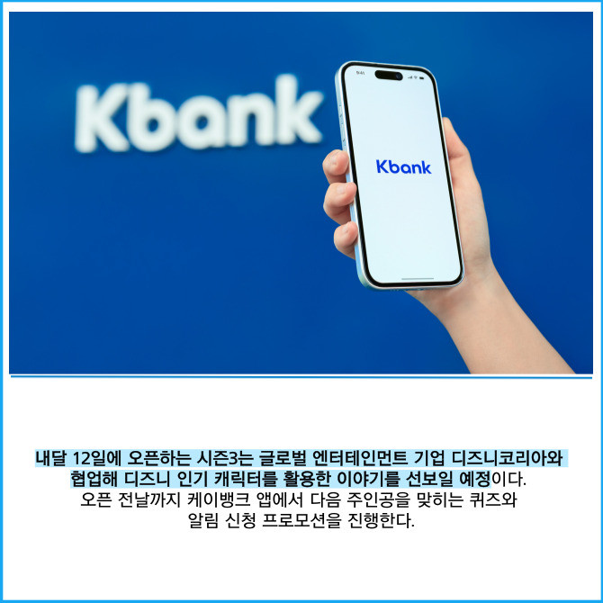 [프라임경제] 케이뱅크는 글로벌 엔터테인먼트 기업 월트디즈니 컴퍼니 코리아와 손잡고 귀여운 디즈니 캐릭터가 등장하는 ‘궁금한 적금’ 시즌3를 시작한다고 28일 밝혔다.