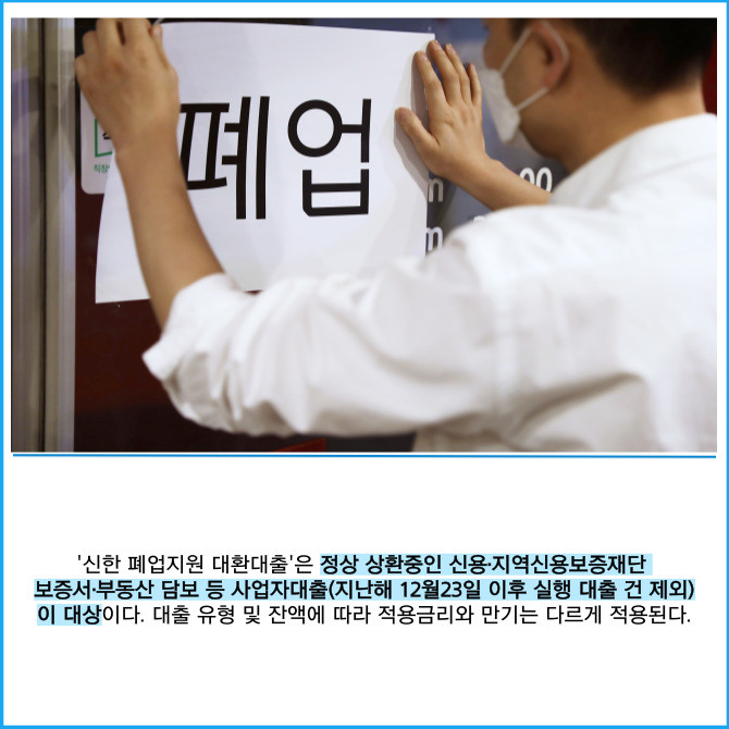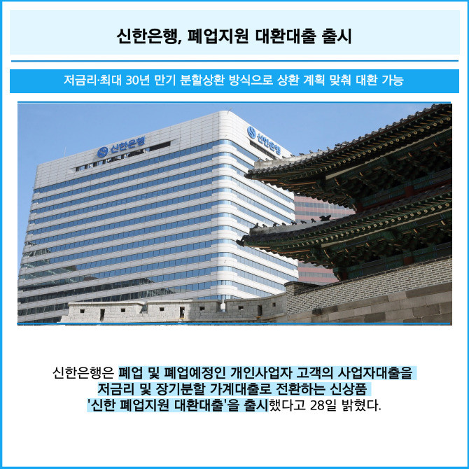 [프라임경제] 신한은행은 폐업 및 폐업예정인 개인사업자 고객의 사업자대출을 저금리 및 장기분할 가계대출로 전환하는 신상품 '신한 폐업지원 대환대출'을 출시했다고 28일 밝혔다.