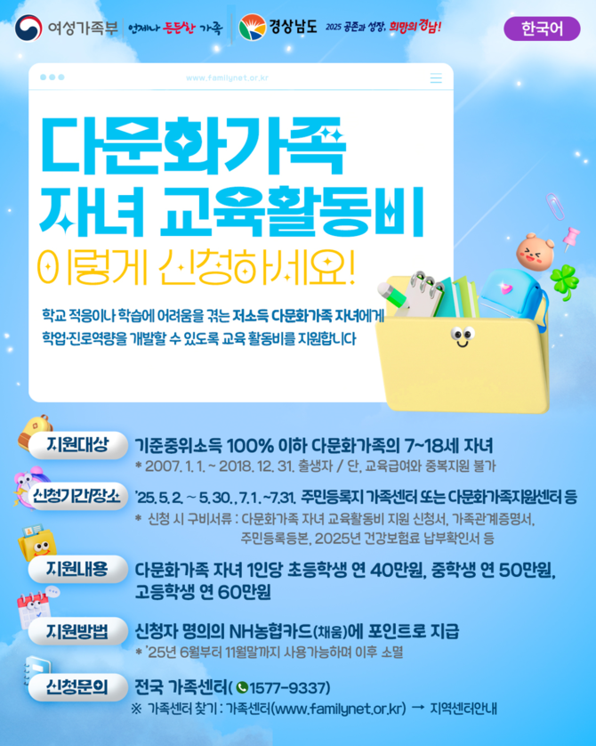 경남도는 다문화가족 자녀에게 교육활동비를 지급해 학습 격차를 해소하고 미래 인재로 성장할 수 있도록 여성가족부와 함께 지난해부터 시행하고 있다.