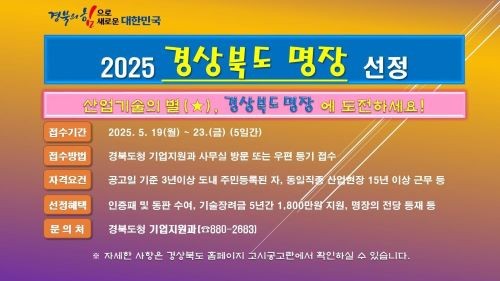 [프라임경제] 경북도가 최고 기술을 갖추고 사회 발전에 공헌하며 경북의 미래 기술경쟁력을 책임질 '2025년 경상북도명장'을 선정·공개 모집한다.