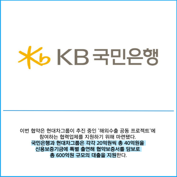 [프라임경제] KB국민은행은 현대자동차그룹(이하 현대차그룹), 신용보증기금과 함께 '미래 모빌리티 글로벌 진출 활성화'를 위한 업무협약을 체결하고, 현대차그룹 협력업체에 총 600억원 규모의 금융 지원을 실시한다고 29일 밝혔다.