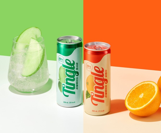 특히 팅글 리얼에이드는 과일에서 추출한 농축 과즙을 그대로 담아낸 것이 가장 큰 특징이다. 청사과는 과즙 환산 기준 20%, 오렌지는 15%의 과즙 농축액을 사용해 과일 본연의 풍미를 즐길 수 있다. 일부 당류 3~4g도 과일 본연의 당류로 설탕을 추가하지 않았다. 이는 자연 그대로의 맛을 선호하는 소비자들의 니즈를 반영한 것으로, 차별화된 저칼로리 고과즙 탄산음료로 자리매김할 예정이다. 또한 청사과는 20㎉, 오렌지는 15㎉의 저칼로리로 출시돼 다이어트 중인 소비자들도 안심하고 건강하게 음용할 수 있다.