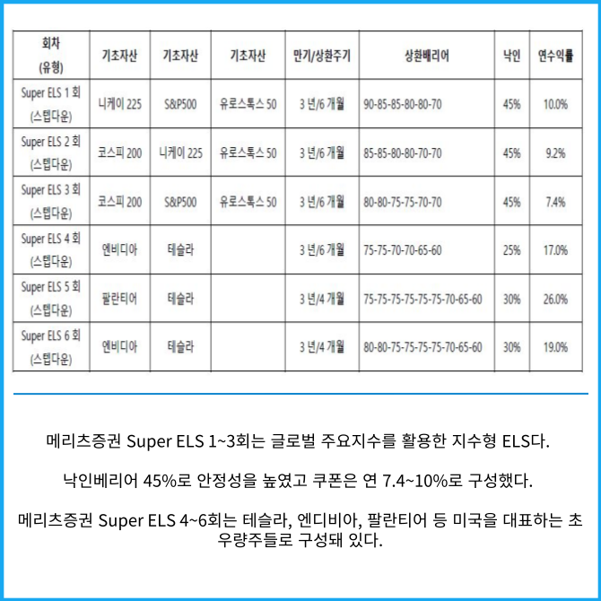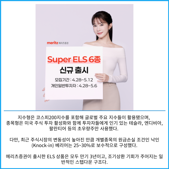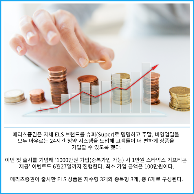 [프라임경제] 메리츠증권은 자체 온라인 모바일트레이딩시스템(MTS) 전용 상품인 주가연계증권(ELS) 상품 6종을 출시한다고 29일 밝혔다.