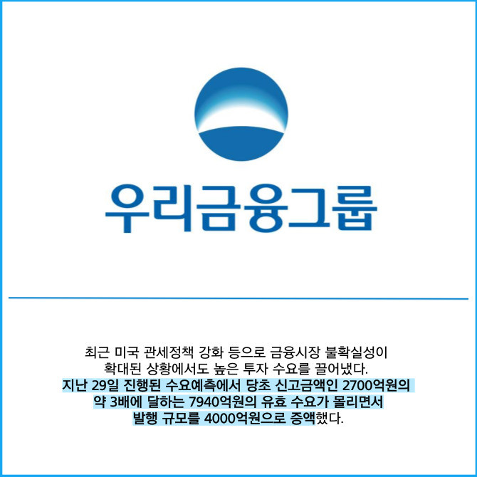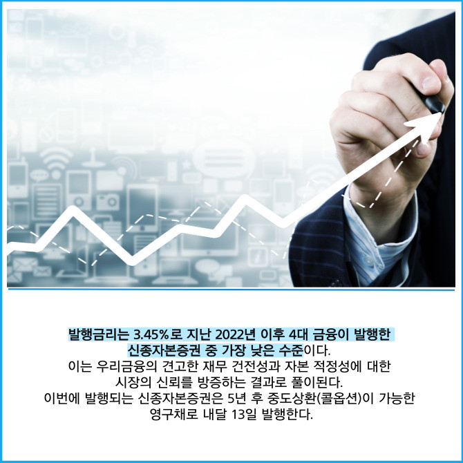 [프라임경제] 우리금융그룹(316140)은 4000억원 규모의 원화 신종자본증권(조건부자본증권) 발행에 성공했다고 30일 밝혔다.
