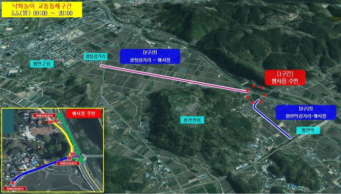통제 구간은 △무진정 행사장 주변 △광정삼~행사장 △함안역삼거리~행사장으로 5월5일 오전 9시부터 밤 10시까지 통제된다.