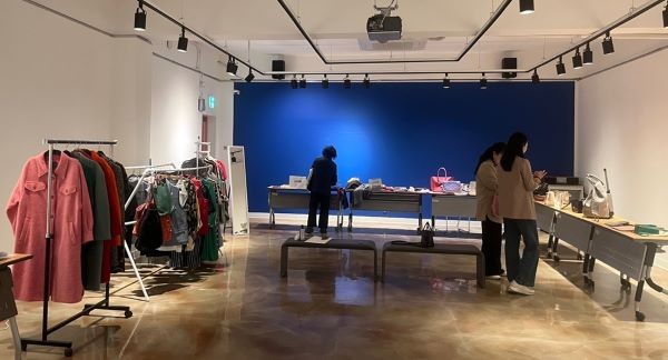 호심미술관에서 열린 장터에는 패션주얼리디자인학과 동아리와 한복협회가 협업한 모던한복 허리치마를 비롯해 중고 가방, 의류, 신발, 장신구 등 150여 점이 새 주인을 기다리고 있다.