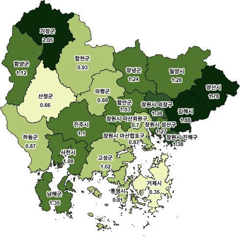 시·군별로는 거창군이 2.05%로 가장 높은 변동률을 보였고, 김해시(1.88%), 양산시(1.78%), 창원시 의창구·진해구(1.38%) 순으로 나타났다. 반면 거제시는 0.35%로 가장 낮은 변동률을 기록했다.