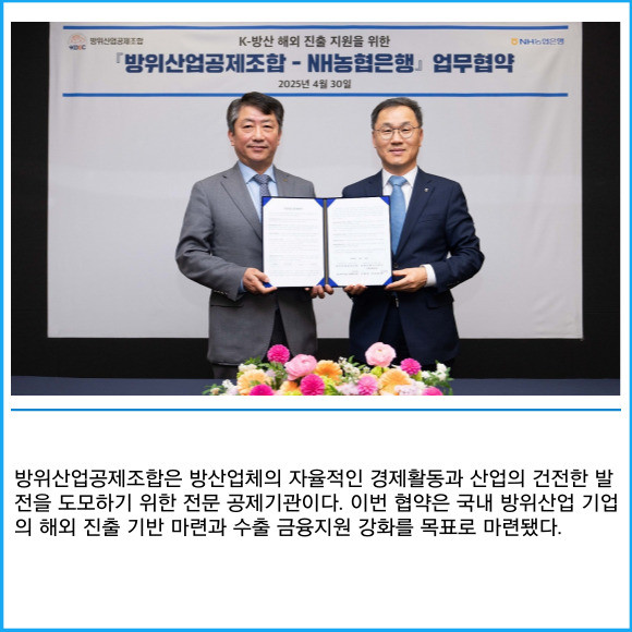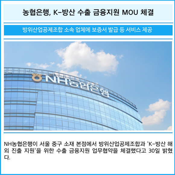 [프라임경제] NH농협은행이 서울 중구 소재 본점에서 방위산업공제조합과 'K-방산 해외 진출 지원'을 위한 수출 금융지원 업무협약(MOU)을 체결했다고 30일 밝혔다.