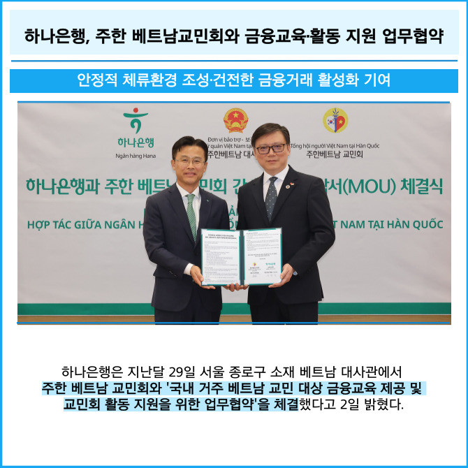 [프라임경제] 하나은행은 지난달 29일 서울 종로구 소재 베트남 대사관에서 주한 베트남 교민회와 '국내 거주 베트남 교민 대상 금융교육 제공 및 교민회 활동 지원을 위한 업무협약'을 체결했다고 2일 밝혔다.