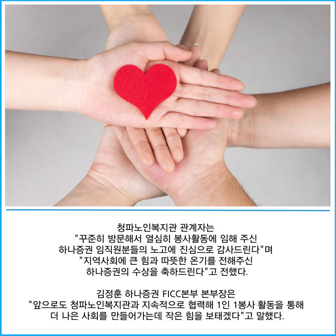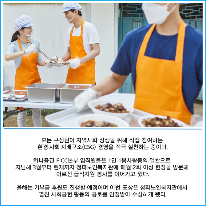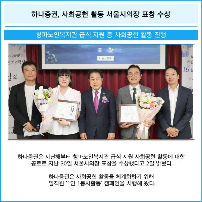 [프라임경제] 하나증권은 지난해부터 청파노인복지관 급식 지원 사회공헌 활동에 대한 공로로 지난 30일 서울시의장 표창을 수상했다고 2일 밝혔다.