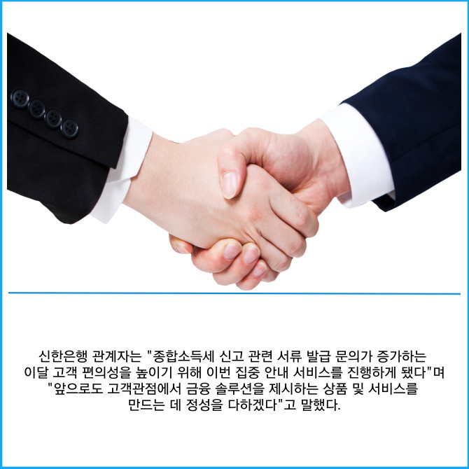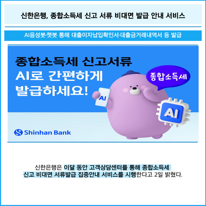 [프라임경제] 신한은행은 이달 동안 고객상담센터를 통해 종합소득세 신고 비대면 서류발급 집중안내 서비스를 시행한다고 2일 밝혔다.