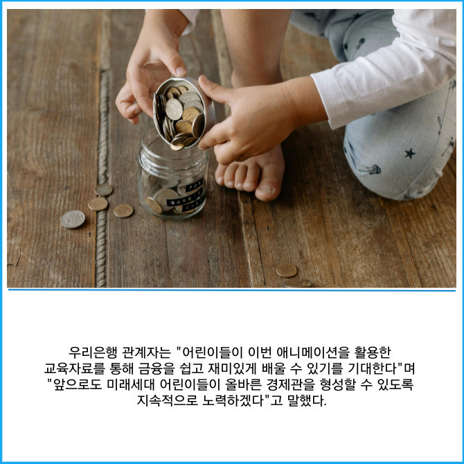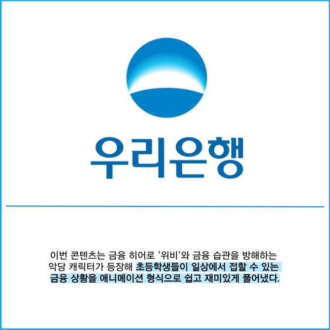 [프라임경제] 우리은행은 초등학생들이 금융을 쉽고 재미있게 배울 수 있도록 제작한 금융교육 애니메이션 콘텐츠 '위비프렌즈와 함께 배우는 금융 이야기'를 유튜브 공식 채널에 공개했다고 5일 밝혔다.