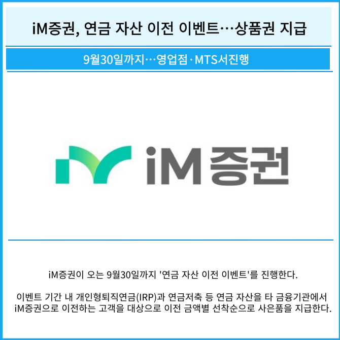 [프라임경제] iM증권이 오는 9월30일까지 '연금 자산 이전 이벤트'를 진행한다.