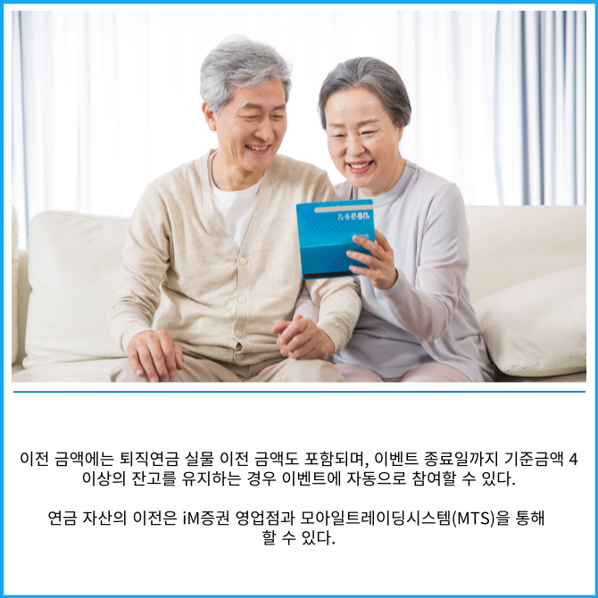 이벤트 기간 내 개인형퇴직연금(IRP)과 연금저축 등 연금 자산을 타 금융기관에서 iM증권으로 이전하는 고객을 대상으로 이전 금액별 선착순으로 사은품을 지급한다.