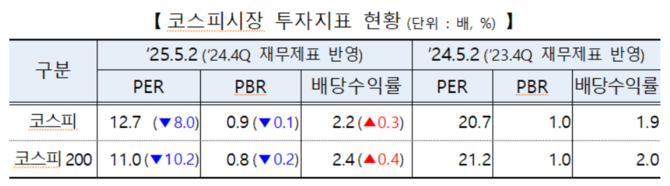 코스피 전체 PBR은 전년 동기 대비 01.배 줄어든 0.9배 수준을 기록했다. 같은 기간 PER은 8.0배 감소한 20.7배로 집계됐다.