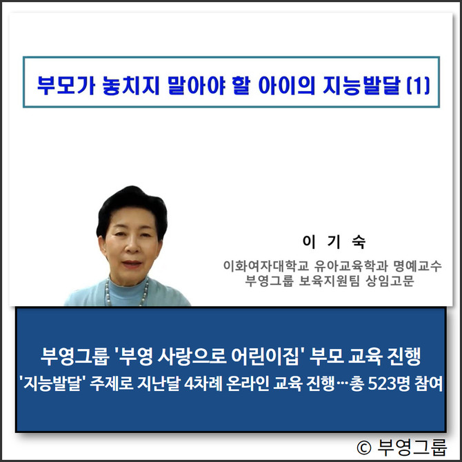 7일 부영그룹에 따르면 이번 교육은 국내 유아교육 권위자인 이기숙 부영그룹 상임 고문(이화여대 유아교육과 명예교수)이 '부모가 놓치지 말아야 할 아이의 지능발달'을 주제로 온라인 교육을 진행했다. 일정은 지난달 21일과 22일, 28일, 29일 총 4일간 이뤄졌다. 교육에 참여한 부모는 총 523명으로 오는 12일까지 유튜브 채널에 교육 영상이 게시될 예정이다.
