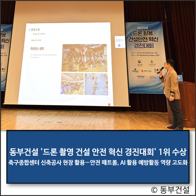 이번 대회에는 건설사 5곳에서 총 7개 팀이 참가한 가운데 동부건설은 현재 시공 중인 '대한민국 축구종합센터 신축공사' 현장에서 '드론을 활용한 스마트 안전 예방활동'을 주제로 활용·운영 사례를 발표했다. 드론 장비와 스마트 플랫폼을 활용해 보다 효율적으로 현장을 관리하고 여러 안전관리 방안들을 도출해 적용한 결과, 창의·적극성 등에서 높은 점수를 받은 것으로 알려진다.