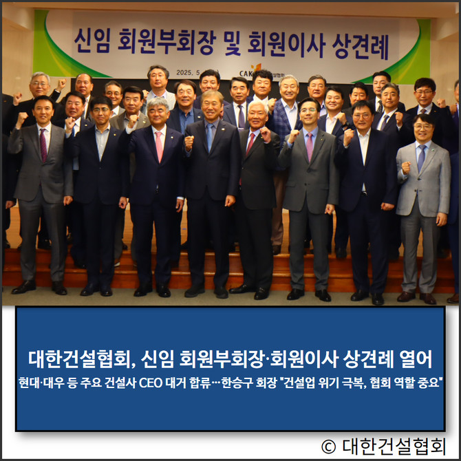 신임 회원부회장 겸 회원이사는 이한우 현대건설 대표, 정원주 대우건설 회장, 박상신 디엘이앤씨 대표, 김승모 한화 대표, 박철희 호반건설 대표, 김정일 코오롱글로벌 대표, 조완석 금호건설 대표, 윤진오 동부건설 대표 등이다.