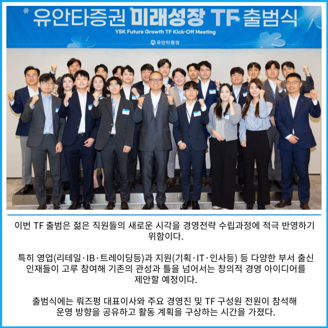 [프라임경제] 유안타증권(003470)은 서울 여의도 본사 YSK홀에서 '미래성장TF' 출범식을 개최하고 공식 활동을 시작했다고 8일 밝혔다.