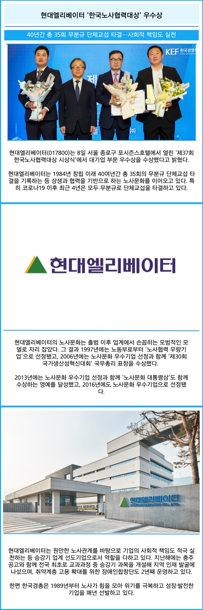 [프라임경제] 현대엘리베이터(017800)는 8일 서울 종로구 포시즌스호텔에서 열린 '제37회 한국노사협력대상 시상식'에서 대기업 부문 우수상을 수상했다고 밝혔다.