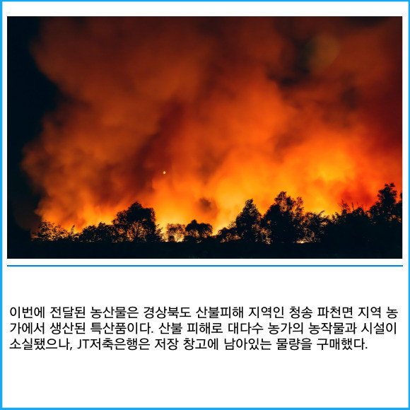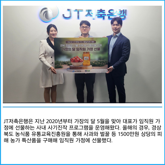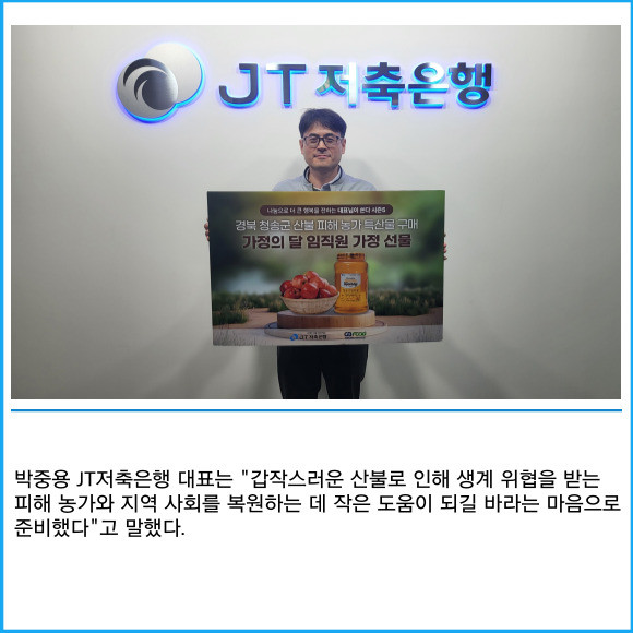 [프라임경제] JT저축은행이 대형 산불 피해를 본 경상북도 지역 농가의 재배 특산품을 구매해 임직원 가정에 선물했다고 8일 밝혔다.