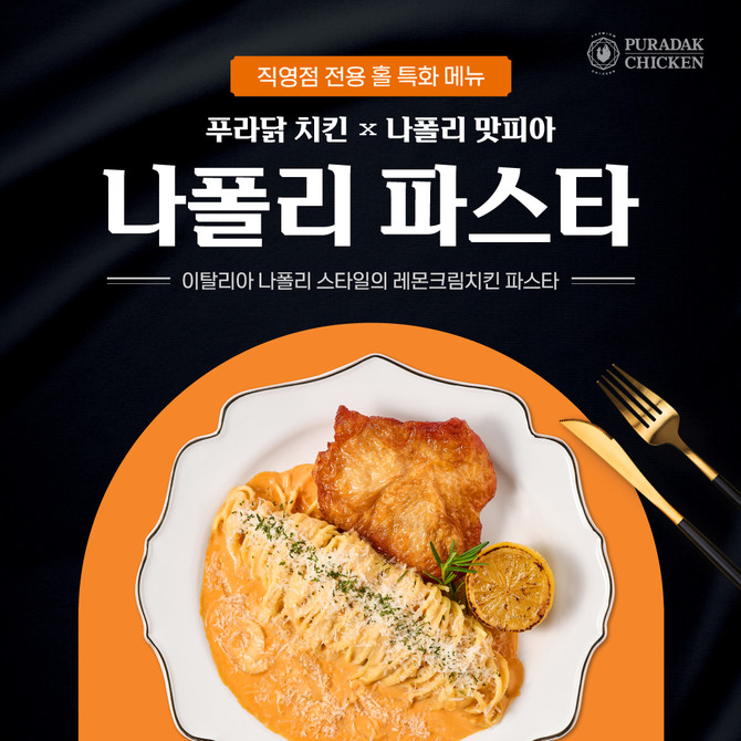 새롭게 선보이는 메뉴는 '나폴리 파스타'로, 푸라닭 치킨과 '나폴리 맛피아' 권성준 셰프가 공동 개발한 이탈리아 나폴리 스타일의 레몬크림치킨 파스타이다. 나폴리 인근 아말피 해안의 대표 특산물인 레몬을 핵심 재료로 활용했다. 레몬의 상큼함을 살린 꾸덕한 크림 파스타에 오븐에 구워 더 맛있는 치킨을 더한 것이 특징이다.