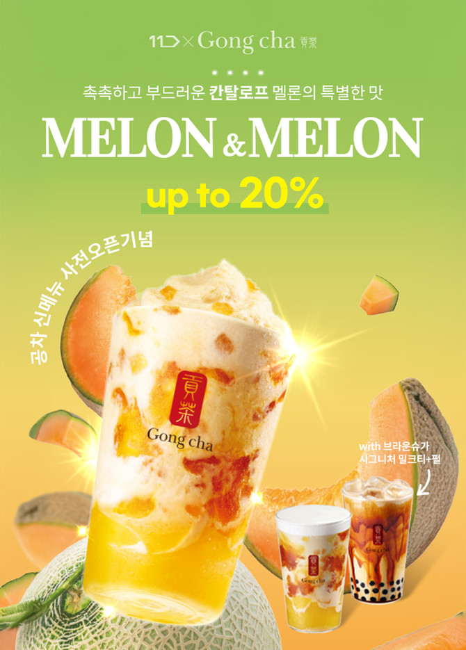 먼저, 공차코리아는 11번가의 그랜드십일절 프로모션을 통해 5월8일부터 14일까지 7일간 디지털 상품권 1만원권과 제품 교환권을 각각 15%, 20% 할인된 가격으로 판매한다. 제품 교환권은 최근 출시돼 많은 인기를 끌고 있는 '브라운슈가 시그니처 밀크티+펄'과 곧 출시를 앞두고 있는 신메뉴 '멜론멜론 젤리 밀크티', '멜론멜론 젤리 크러쉬'로 구성됐다. 신메뉴 멜론멜론 시리즈 2종은 5월14일부터 사용 가능하며, 상큼한 노란빛 비주얼로 출시 전부터 소비자들의 기대감을 모으고 있다.