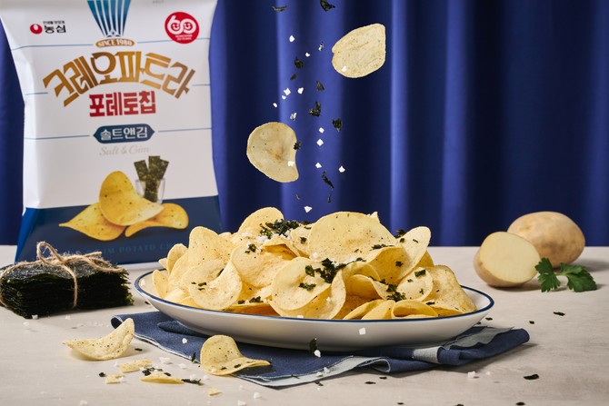 농심(004370)이 감자칩 스낵 '크레오파트라' 시리즈 2탄 '크레오파트라 솔트앤김'을 출시한다. 담백하고 바삭한 감자칩에 국산 김의 고소한 풍미를 더한 제품이다.