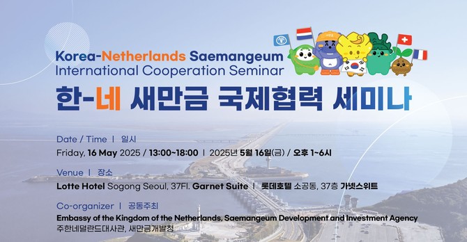[프라임경제] 새만금개발청(청장 김경안)은 주한네덜란드대사관(대사 페이터 반 더 플리트)과 오는 5월16일 서울 소공동 롯데호텔 37층에서 '한·네 새만금 국제협력 세미나'를 공동 개최한다고 밝혔다.