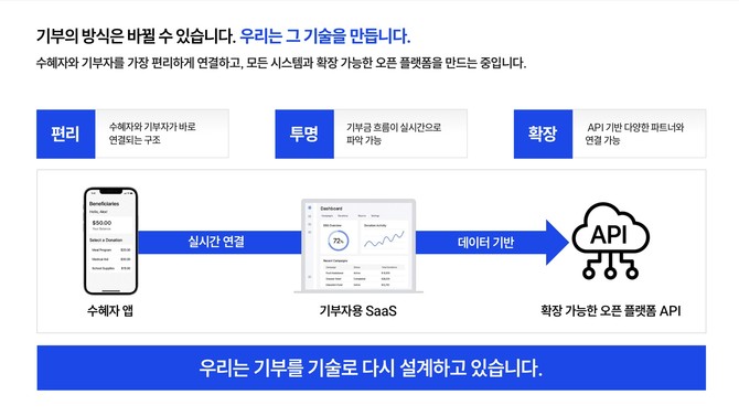 "우리는 기부와 복지가 작동하는 사회 시스템을 만들고자 합니다. 그 중심에 기술이 있고, 연결이 있습니다."