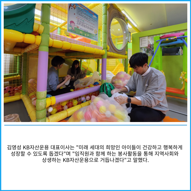 [프라임경제] KB자산운용이 지역사회와의 상생 실천과 도움이 필요한 아이들에게 따뜻한 사랑을 전하기 위한 봉사활동에 적극적으로 나서고 있다고 9일 밝혔다.