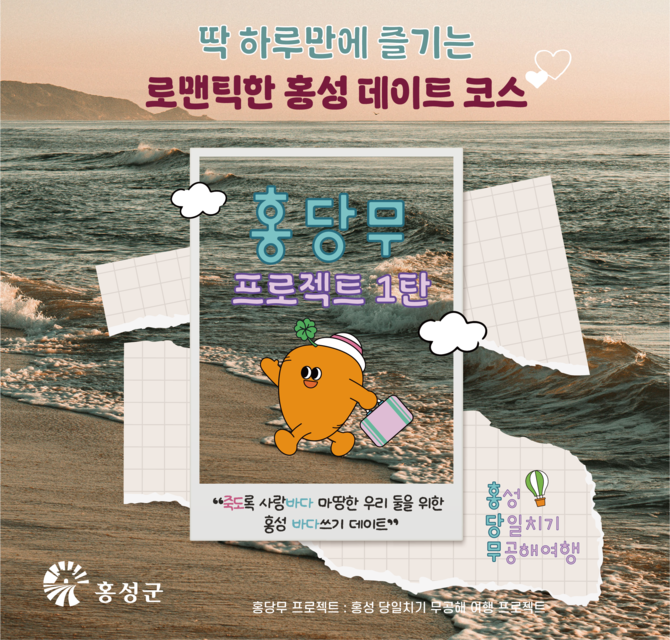 이번 여행상품은 2가지 콘셉트 코스로 구성되며, 첫번째 코스는 '죽도록 사랑받아(바다)마땅한 우리 둘을 위한 홍성 바다쓰기 데이트' 코스로 홍성의 대표 관광지인 △홍성스카이타워 △남당항해양분수공원 △탄소가 없는 섬 죽도로 구성된 관광코스이다.