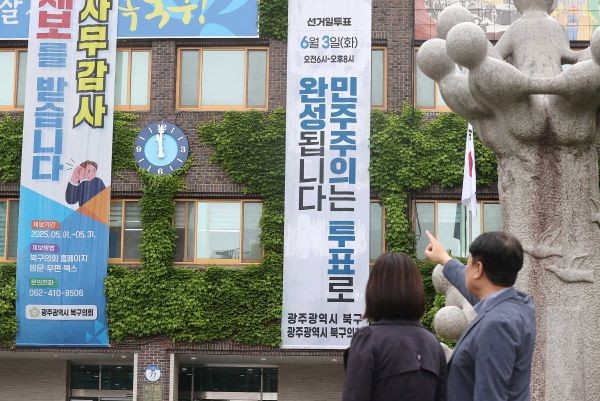 광주 북구(청장 문인)는 제21대 대통령선거를 앞두고 북구청사 외벽에 '민주주의는 투표로 완성됩다'라는 대형 현수막을 게시했다. 구는 온라인과 오프라인 채널을 최대한 활용해 투표 홍보에 적극 나설 계획이다.
