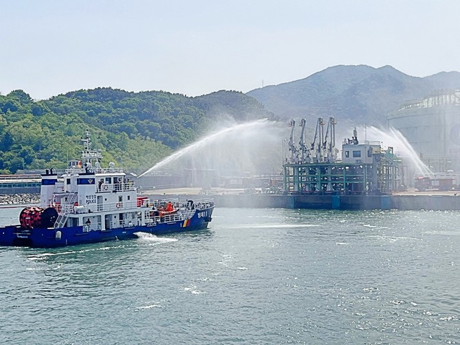 최근 LNG, 메탄올 등 친환경 연료 추진선 증가 추세에 따라, 대형 LNG 취급시설에서의 선박 충돌로 인한 화재, 폭발 등 복합 재난사고를 가상해 실전형 훈련으로 진행됐다.