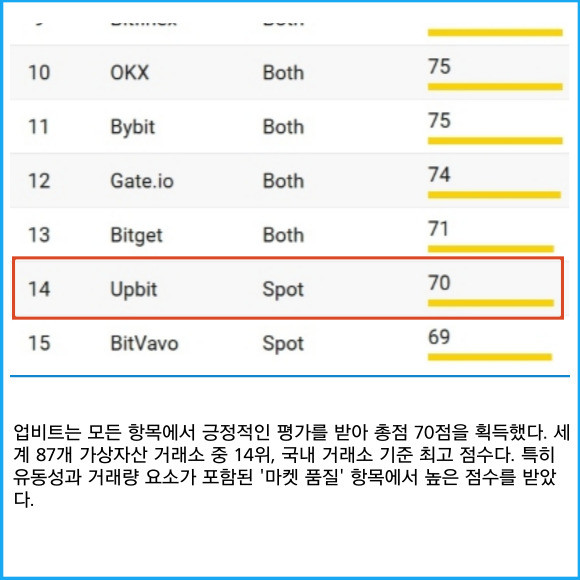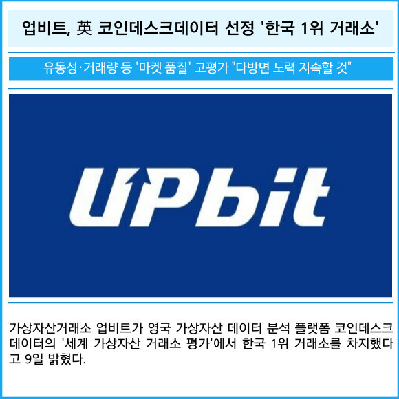 [프라임경제] 가상자산거래소 업비트가 영국 가상자산 데이터 분석 플랫폼 코인데스크데이터의 '세계 가상자산 거래소 평가'에서 한국 1위 거래소를 차지했다고 9일 밝혔다.