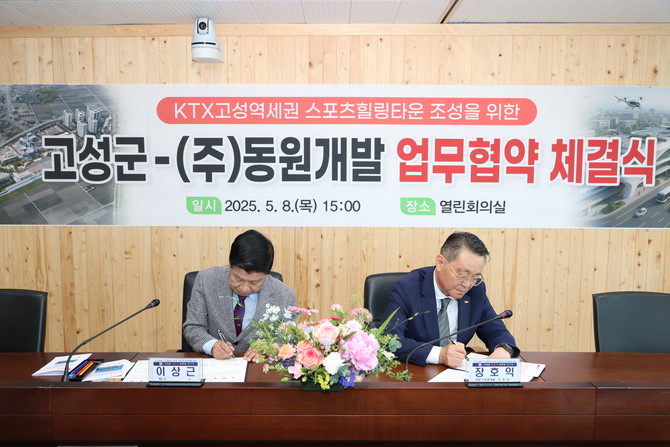 [프라임경제] 고성군이 남부내륙철도(KTX) 2030년 12월 개통을 앞두고 고성역세권 개발사업의 속도를 높인다. 군은 지난 5월8일 군청 열린회의실에서 'KTX 고성역세권 스포츠힐링타운' 조성을 위한 민관협력 강화 업무협약(MOU)을 ㈜동원개발과 체결했다.