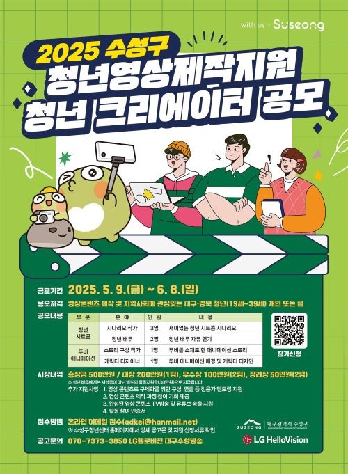 김대권 수성구청장은 "재능 있는 청년들이 직접 창작과 제작에 참여하며 콘텐츠 산업의 가능성을 경험하고, 지역 청년 문화의 활력을 이끄는 계기가 되길 바란다"며 "수성구는 앞으로도 청년이 주도하는 창작활동을 지속적으로 지원하겠다"고 밝혔다.