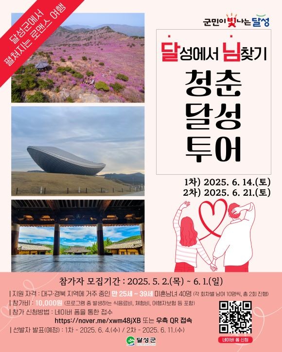 [프라임경제] 대구 달성군(군수 최재훈)이 오는 6월1일까지 미혼남녀를 대상으로 '달성에서 님찾기 청춘달성투어' 참가자를 모집한다.