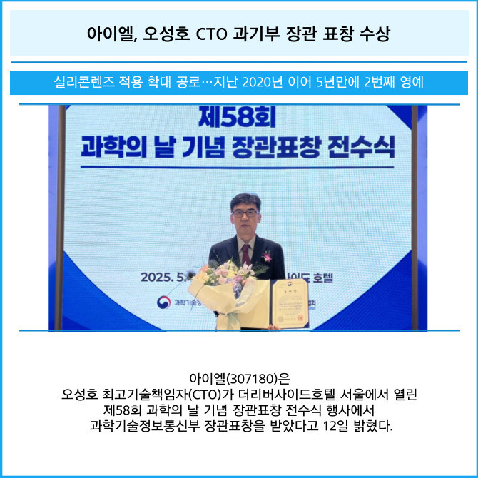[프라임경제] 아이엘(307180)은 오성호 최고기술책임자(CTO)가 더리버사이드호텔 서울에서 열린 제58회 과학의 날 기념 장관표창 전수식 행사에서 과학기술정보통신부 장관표창을 받았다고 12일 밝혔다.