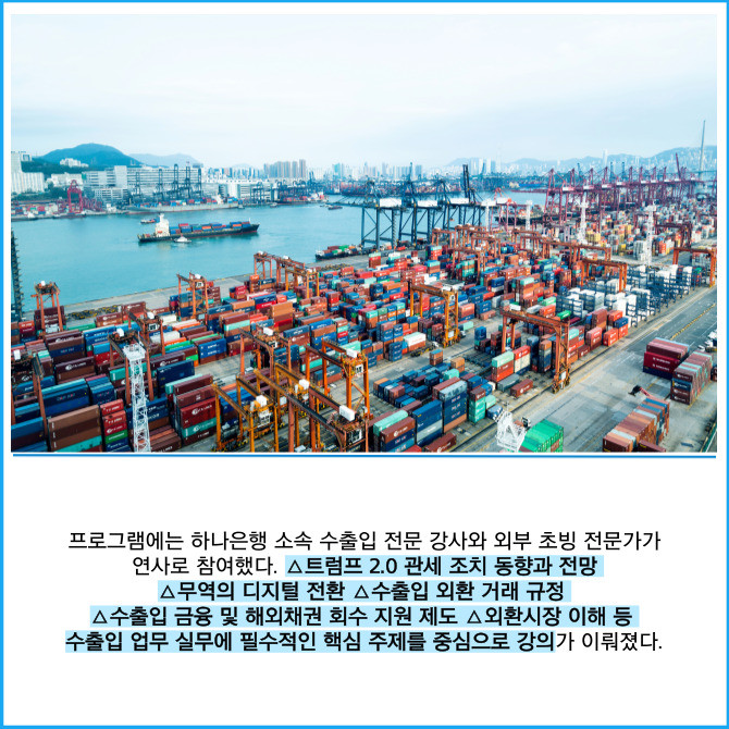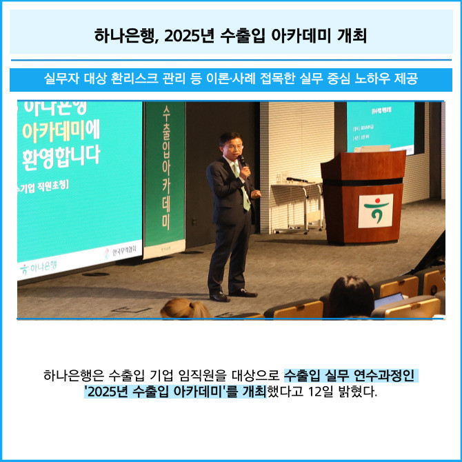 [프라임경제] 하나은행은 수출입 기업 임직원을 대상으로 수출입 실무 연수과정인 '2025년 수출입 아카데미'를 개최했다고 12일 밝혔다.
