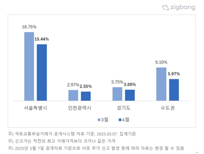 반면 수도권 전체 신고가 거래 비중은 3월 9.10%에서 5.97%로 낮아졌으며 서울(18.75%→15.44%)·인천(2.97%→2.55%)·경기(3.75%→3.08%) 모두 소폭 감소했다. 이는 △토지거래허가구역 재지정 △7월 스트레스 DSR 3단계 △조기 대선 등 주요 정책·제도 변화를 향한 관망 심리가 확산되며, 거래가 위축된 영향으로 풀이된다.