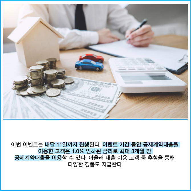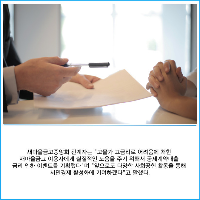 [프라임경제] 새마을금고중앙회는 공제계약대출을 이용한 고객에게 한시적 이자율 인하 및 경품 지급 이벤트를 진행한다고 12일 밝혔다.