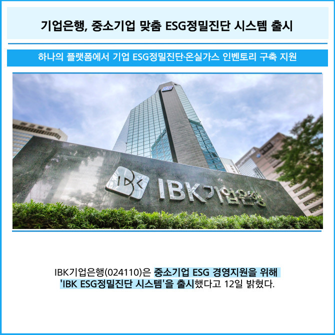 [프라임경제] IBK기업은행(024110)은 중소기업 ESG 경영지원을 위해 'IBK ESG정밀진단 시스템'을 출시했다고 12일 밝혔다.