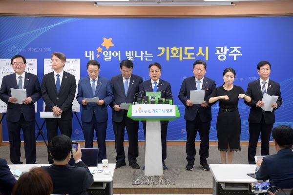 12일 광주시청 브리핑룸에서 열린 기자회견에는 강기정 광주시장, 이정선 광주시교육감, 임택 동구청장, 김이강 서구청장, 김병내 남구청장, 문인 북구청장, 박병규 광산구청장이 참석했다.