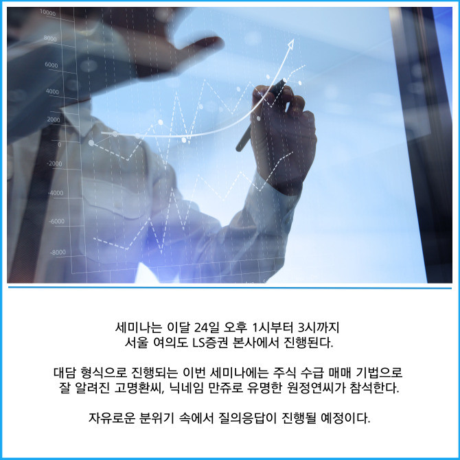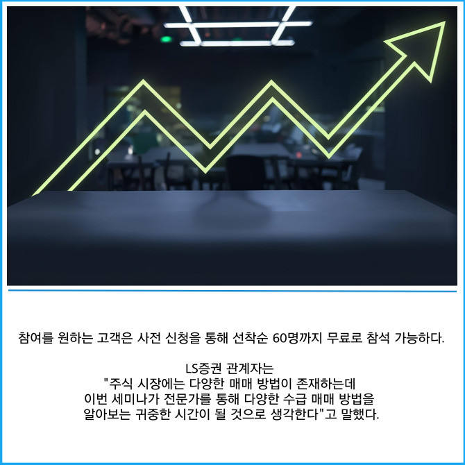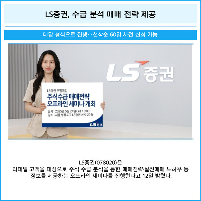 [프라임경제] LS증권(078020)은 리테일 고객을 대상으로 주식 수급 분석을 통한 매매전략·실전매매 노하우 등 정보를 제공하는 오프라인 세미나를 진행한다고 12일 밝혔다.
