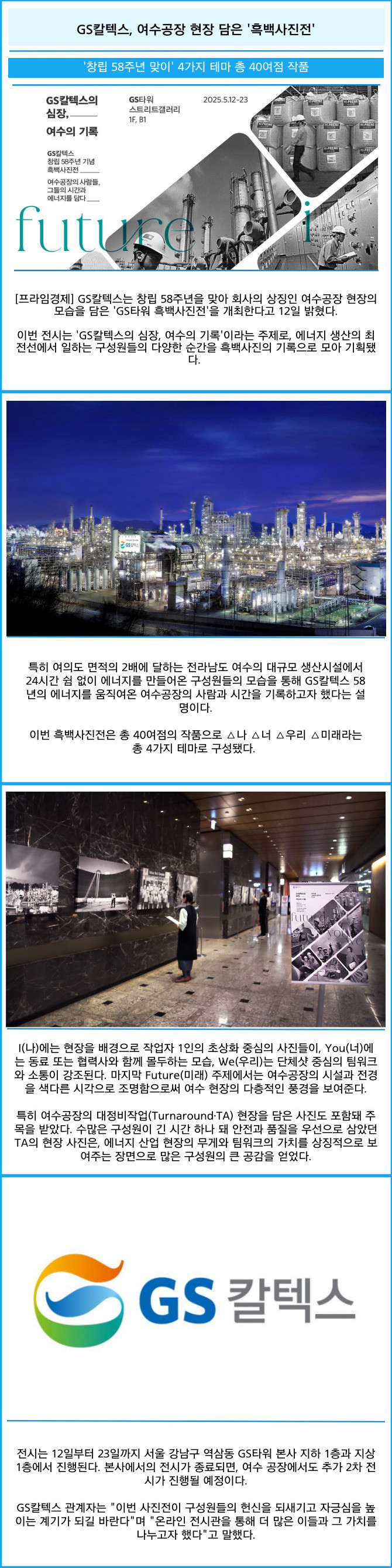 [프라임경제] GS칼텍스는 창립 58주년을 맞아 회사의 상징인 여수공장 현장의 모습을 담은 'GS타워 흑백사진전'을 개최한다고 12일 밝혔다.